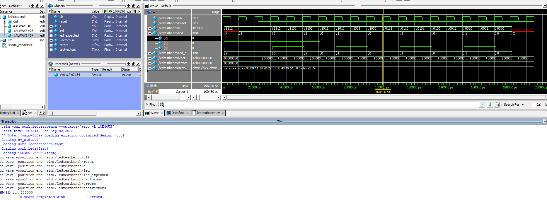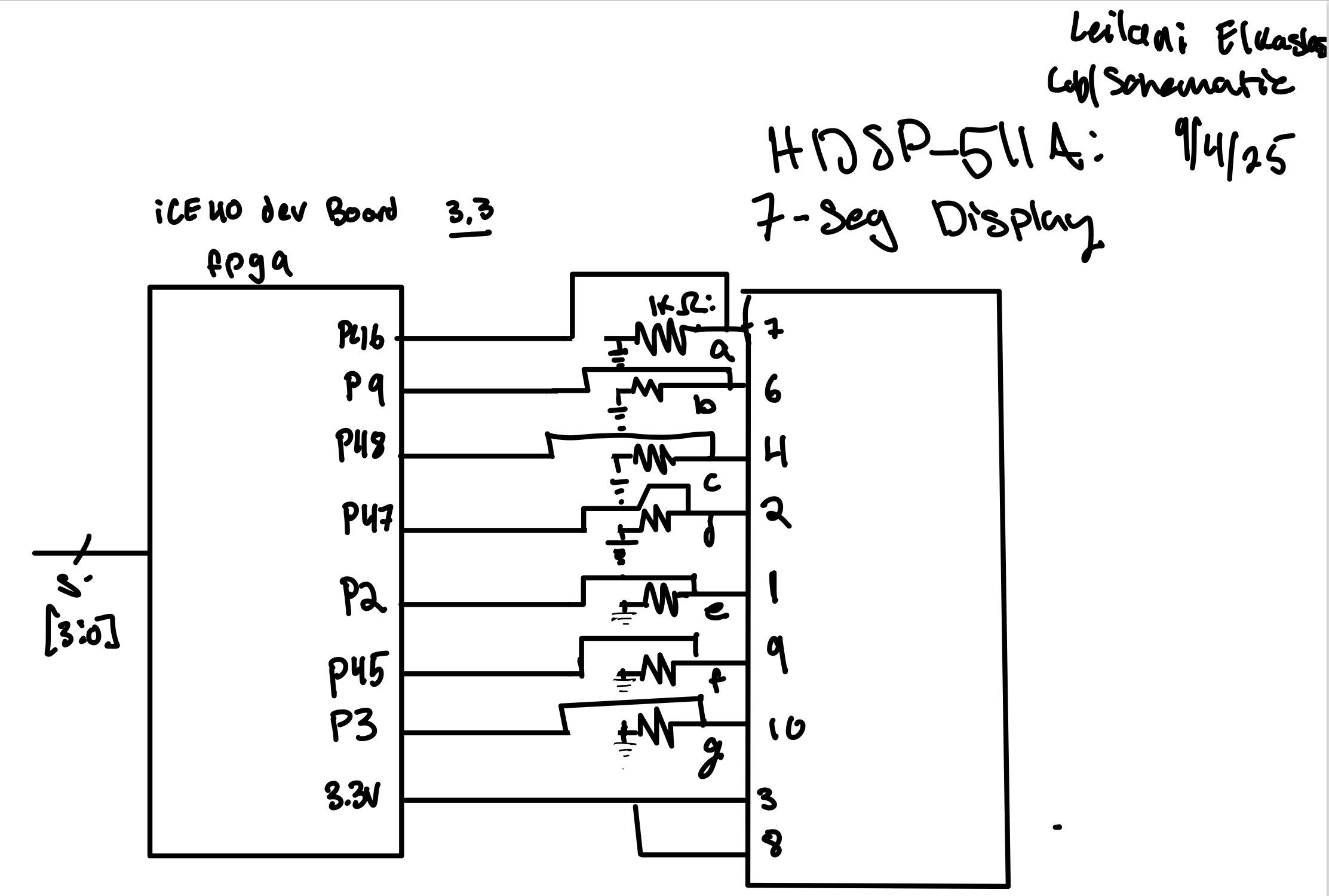 This week a iCE40 UP5K FPGA development board was assembled to house a UPduino v3.1 MCU. The board’s functionality was verified by programming a seven segment display to represent all digits of hex based on 4 switches on the dev board represented by inputs s[3:0]. In order to further test the functionality three LEDs on the dev board were programmed- 2 to turn on based on inputs s[3:0] and 1 to oscillate at 2.4 Hz. Both the seven segment display and all 3 leds worked as expected, both in sim and in situ, confirming the FPGA dev board’s functionality. This process took a total of 30 hours.