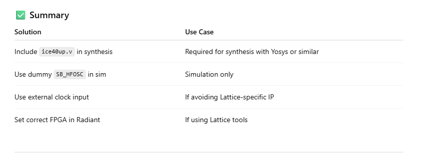 None of the suggested resolutions included establishing SB_HFOSC as a module. It instead put out a bunch of solutions that seemed to overcomplicate things.